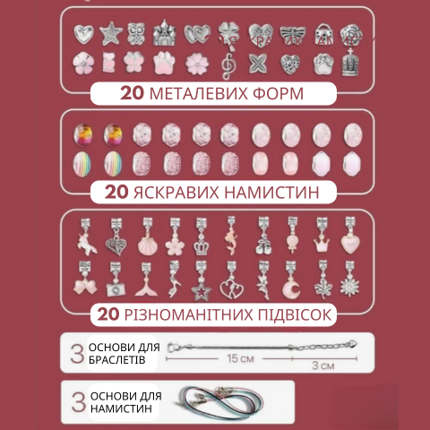 - 4 зіп пакети з прикрасами (20 металевих форм, 20 намистин, 20 підвісок, 3 основи для браслетів, 3 основи для намистин)